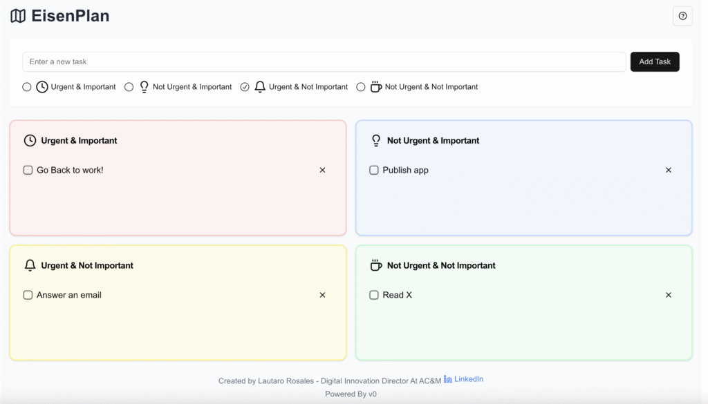 Allá por el 2023, creé Eisenplan, una web app muy sencilla hecha con v0, una muy buena primera implementación de generación de apps usando modelos de inteligencia artificial. La app de Eisenplan, no era más que una matrix de Eisenhower, que usando local storage armé para mí y la uso desde entonces. Esto no lo hice con ningun fin comercial, simplemente tenia la necesidad, y una suscripción de 20 dolares, y al cabo de unas dos o tres horas de ida y vuelta con v0, la tenia funcional y andando.